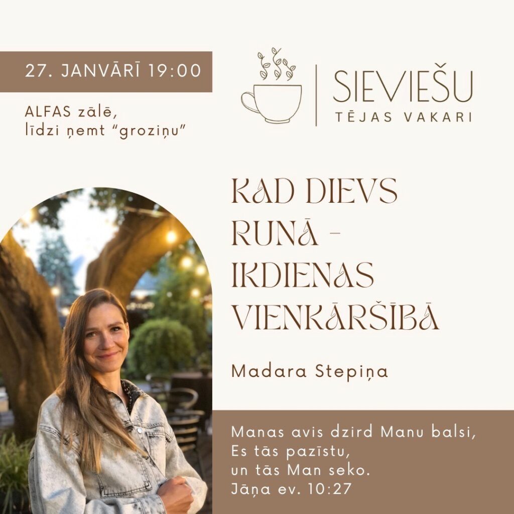 ar prieku aicinām jūs uz janvāra sieviešu tējas vakaru, kur sirsnīgā gaisotnē baudīsim sadraudzību, gūsim iedvesmu un piedzīvosim Dieva klātbūtni.